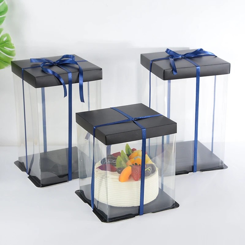 cake carrier box with ribbon, transparent dessert box, plastic pastry packaging, bakery wrapping container, wedding favor cake box, clear party gift box, cupcake transport case, bread biscuit packaging