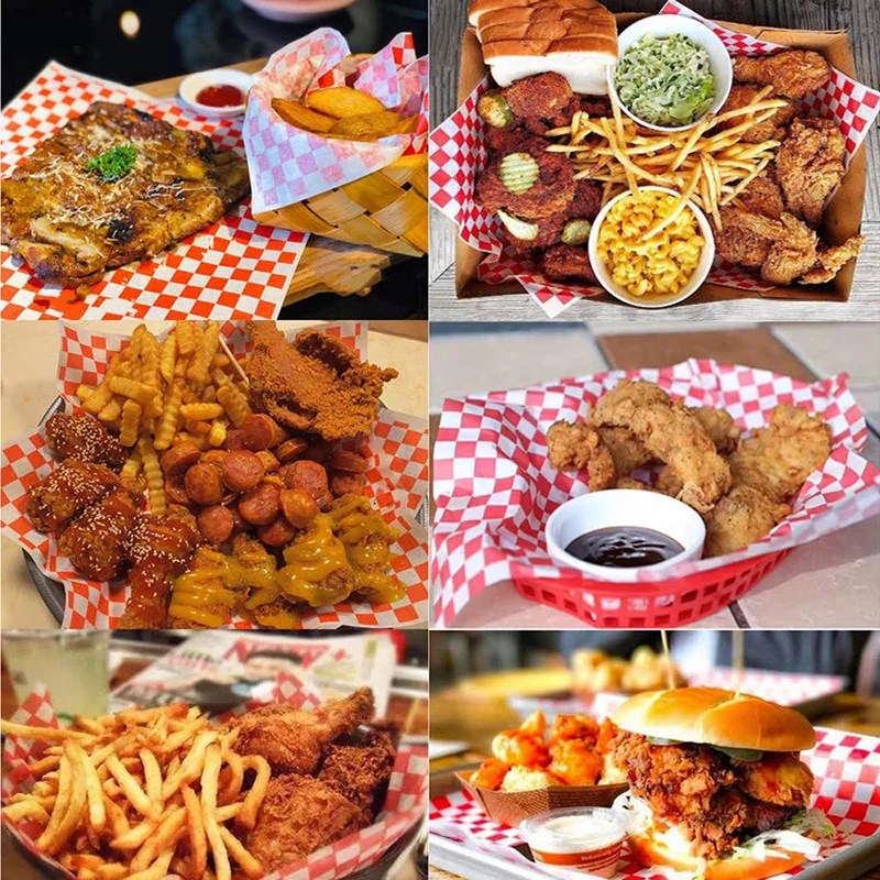 Use these sheets to line trays, wrap burgers, sandwiches, pizza slices, or fried foods such as fries, chicken nuggets, and pastries. They keep servings clean, visually appealing, and hygienic while preventing oil and juice from leaking. Perfect for fast-food outlets, bakeries, catering services, and home kitchens.