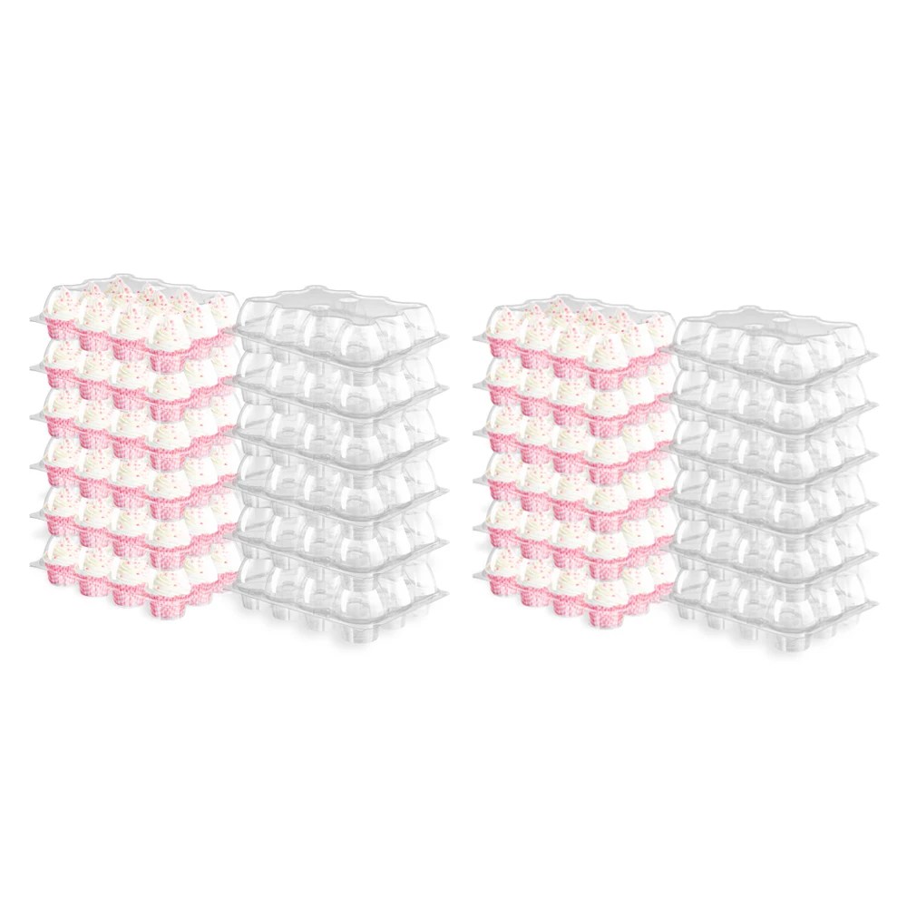 Organize and present your cupcakes with style using this set of 12 or 24 clear plastic cupcake containers. Each container features 12 individual holes to securely hold cupcakes, muffins, or other small desserts, keeping them safe from spills and damage during transport or display. Designed with detachable lids, these stackable boxes provide convenience, versatility, and a professional presentation for parties, weddings, birthdays, or bakery displays.