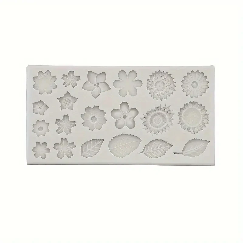 This fondant chocolate silicone mold is designed with a variety of floral patterns including roses, sunflowers, leaves, and small daisies. Perfect for creating elegant and detailed cake decorations, it is a versatile tool for bakers, hobbyists, and craft enthusiasts. Use it to make fondant toppers, chocolates, candies, jellies, or even resin art pieces, adding a creative and professional touch to your desserts or handmade crafts.