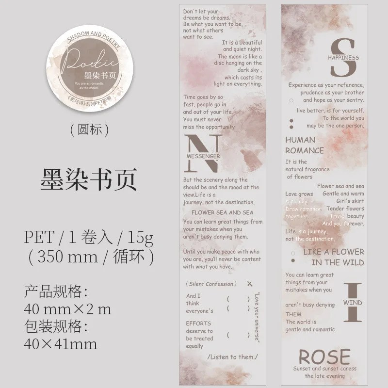 Each tape features clear transparency and classic English text motifs, perfect for overlaying on paper boxes, wrapping bags, or handmade cards. The glossy PET film ensures excellent adhesion and long-lasting use without fading or tearing. Ideal for enhancing packaging presentation or for creative journaling enthusiasts who appreciate minimalist vintage aesthetics.