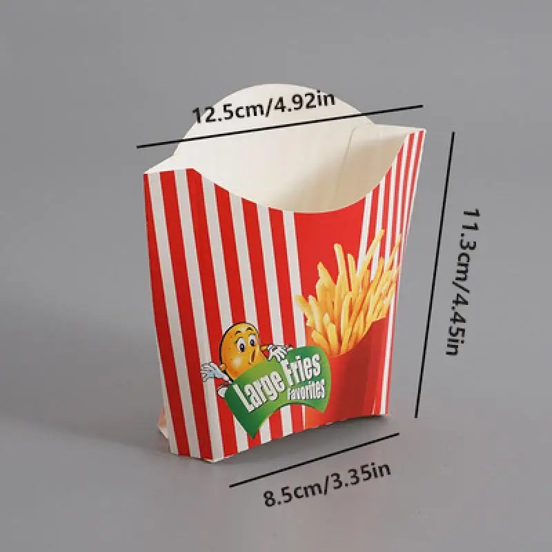 These 50PCS Disposable Paper French Fry Boxes are a versatile and eco-friendly packaging solution for a variety of snacks. Designed with convenience and sustainability in mind, these paper boxes are perfect for fries, charcuterie, salads, fruit, popcorn, chicken wings, or other party foods. They are lightweight, easy to carry, and disposable, making them an excellent choice for both personal use and commercial food service.