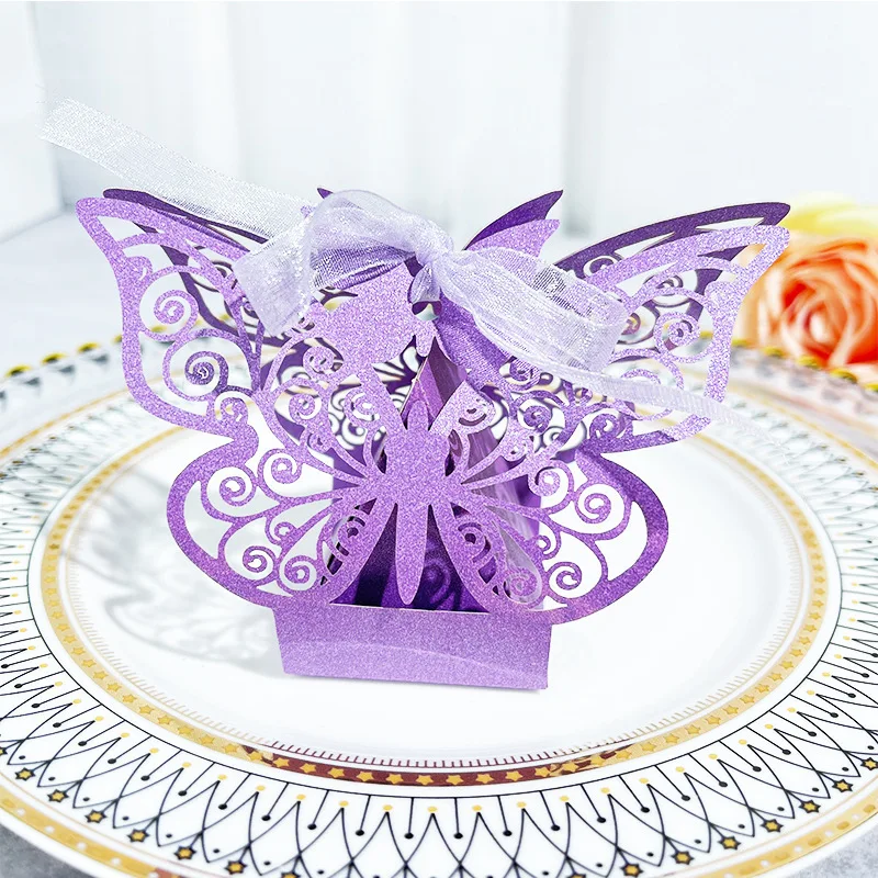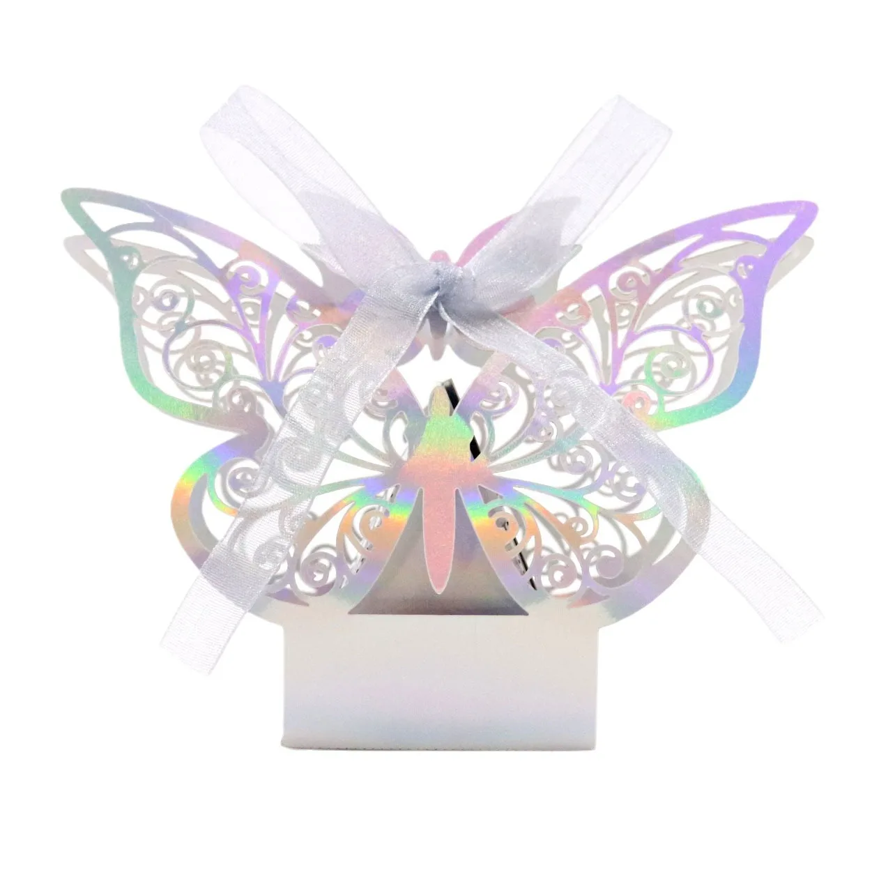 Our candy gift boxes come in two unique styles: classic solid colors and shimmering rainbow laser designs. The solid color collection includes timeless shades such as white, pink, red, blue, ivory, and purple, which easily match with any wedding or event theme. For those who want something eye-catching, the rainbow laser cut version adds a sparkling effect that reflects light beautifully, creating a dazzling presentation that makes your party favors unforgettable.