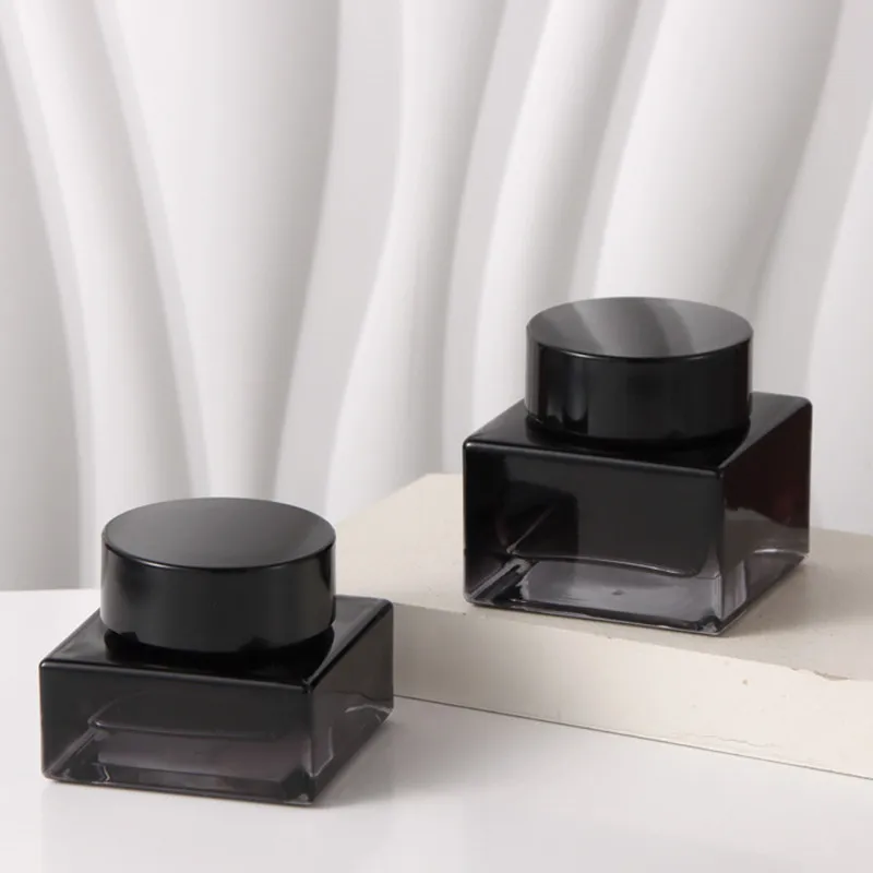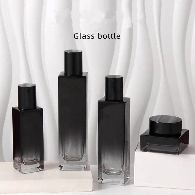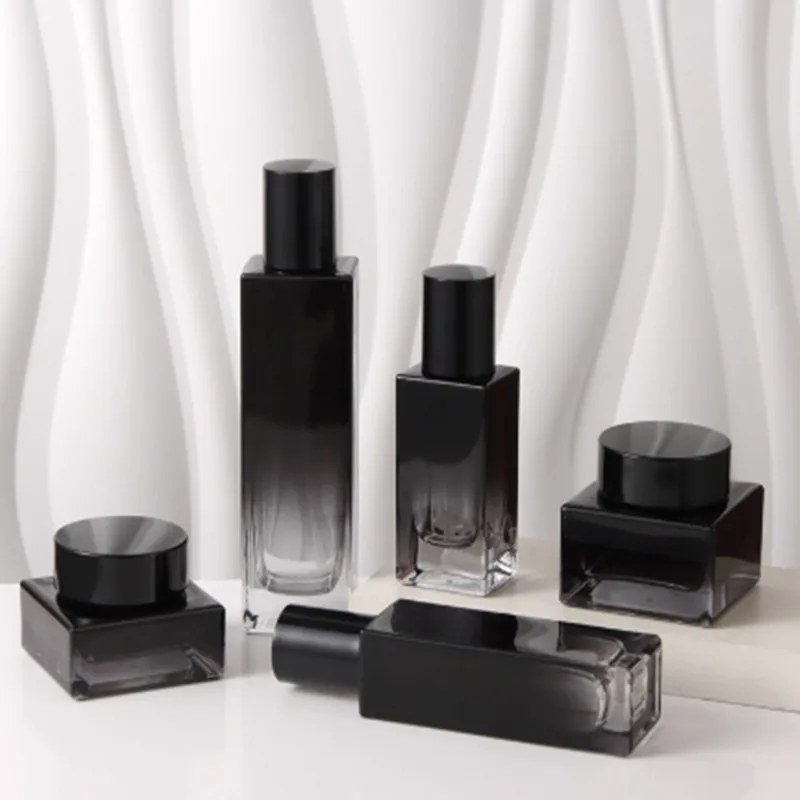 cosmetic container set cream jars lotion pump bottles serum bottles, 30/50g 20-120ml clear black glass, refillable travel cosmetic bottles, skincare travel containers, boutique display jars and bottles, OEM ODM refillable glass containers