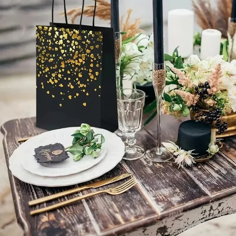 These bronzing kraft paper bags feature an elegant gold foil-printed “Love” design that mimics the precision of laser engraving, adding a luxurious finish to every detail. The reflective metallic surface contrasts beautifully with the rustic kraft paper, creating a premium look and feel that’s perfect for upscale events.