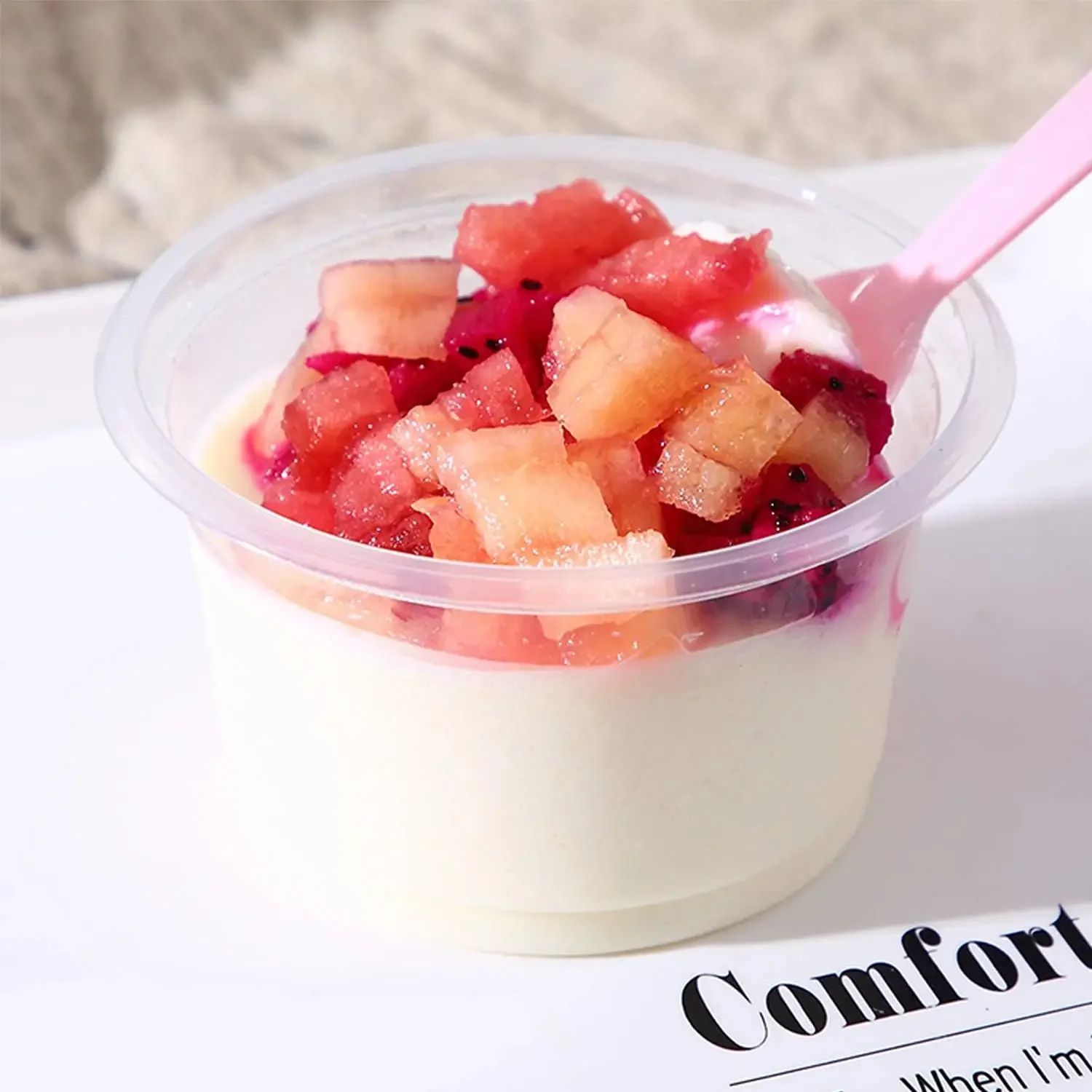 These clear cups are made from food grade plastic. The dessert cups are safe and strong. You can use them to store dessert, chocolate mousse, fruit salads and small snacks. Its simple design makes it perfect for a variety of beverages, a great addition to your kiosk, concession stand, fast food restaurant.