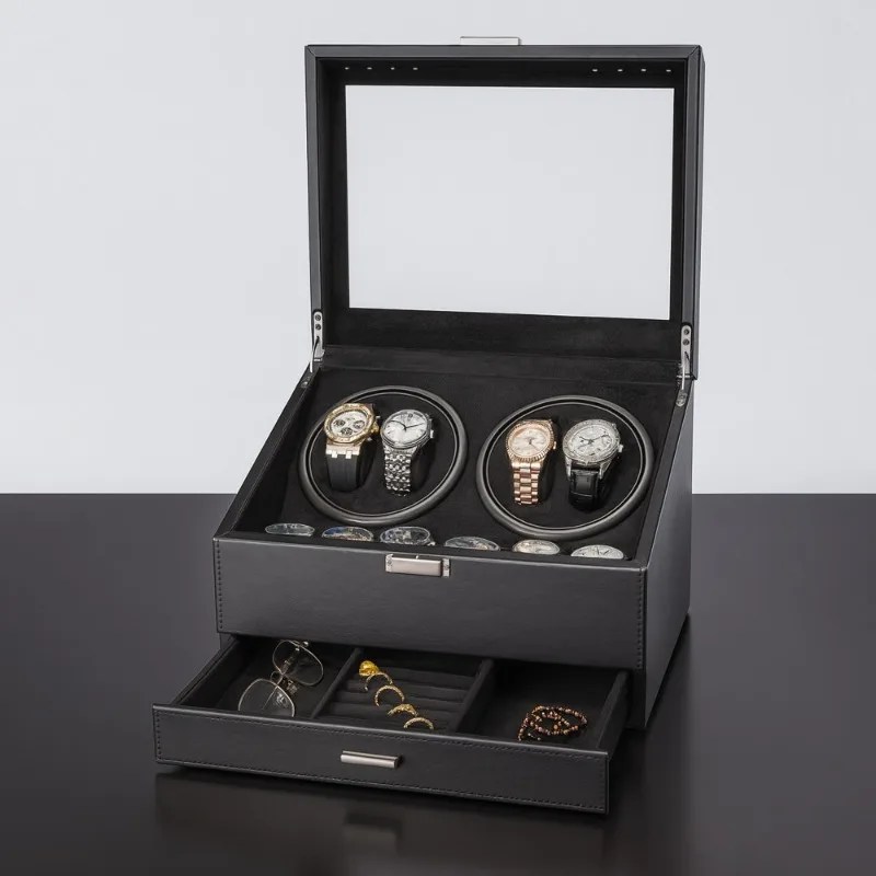 Give your valuable timepieces the care they deserve with this advanced automatic watch winder and organizer. Designed with elegance and functionality in mind, it provides consistent motion for mechanical watches while offering refined storage. The unit not only keeps watches ready to wear but also enhances the presentation of your collection.