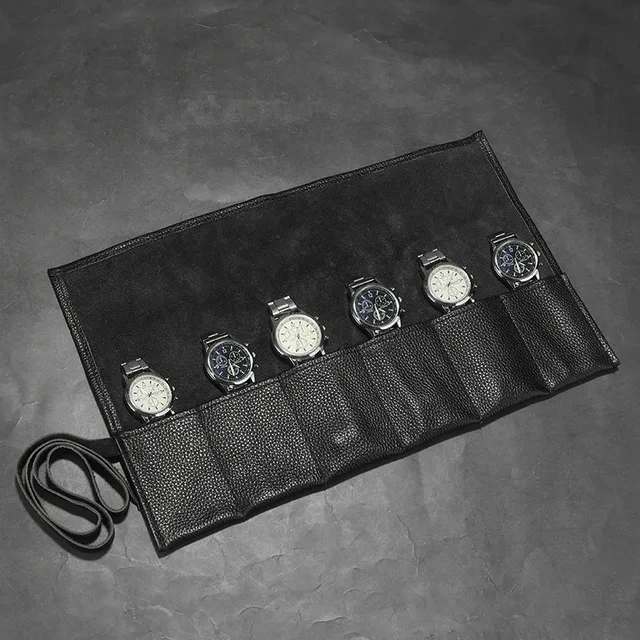 Hot selling 6 Slots Black Leather Watch Storage Bag Roll up Watch Bag Portable Travel Display Smart Watch Storage Box