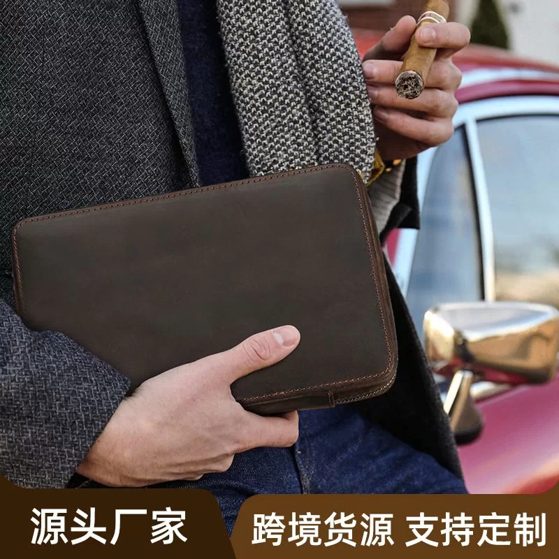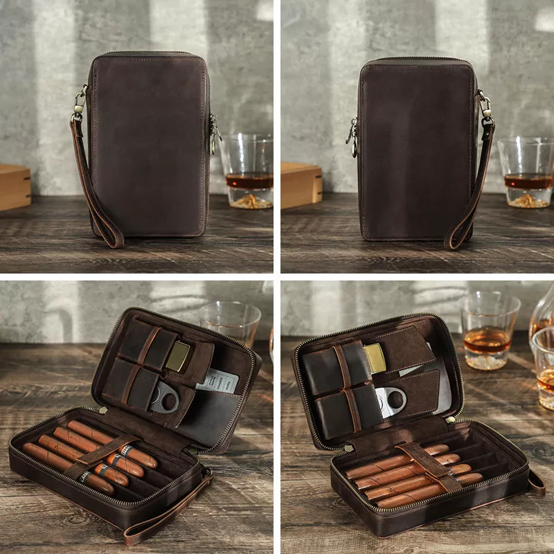 leather cigar travel humidor 🥃 – Crazy Horse cowhide 4-slot portable humidor with dual zipper, cedar lining, cutter & lighter holders, wrist strap, leather retention strips, free laser engraving, vintage patina, travel & gift ready for men