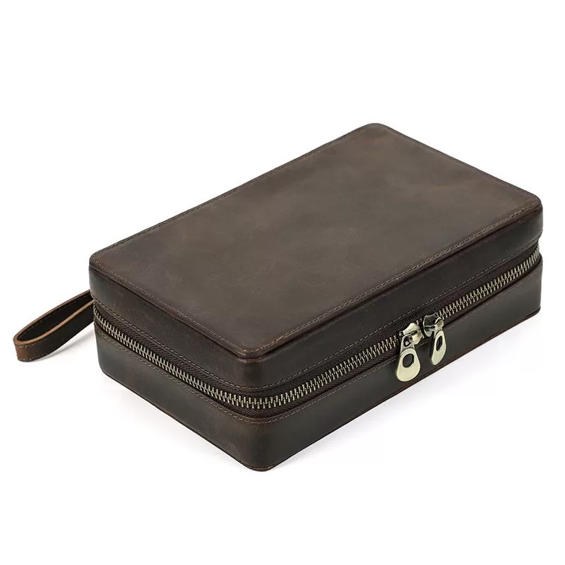 leather cigar travel humidor is a premium Crazy Horse cowhide leather travel organizer designed for the sophisticated cigar enthusiast who demands style, protection, and portability. Handmade and travel-optimized, this 4-slot humidor stores cigars securely with dedicated cutter and lighter holders, cedar lining, and a dual zipper perimeter closure for maximum protection.
