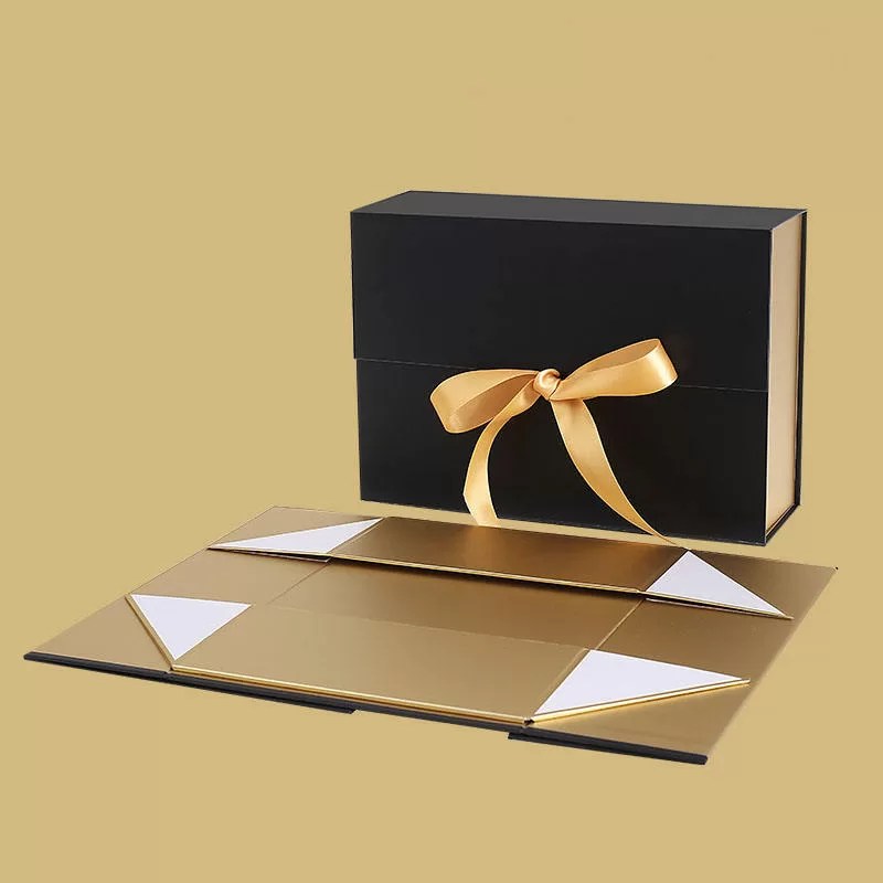 Elevate your gift presentation with this luxury magnetic double-door folding box, crafted with a refined black and gold color scheme and premium paperboard material. Designed with functionality and aesthetics in mind, the magnetic flap ensures secure closure while the ribbon handle enhances portability and elegance.