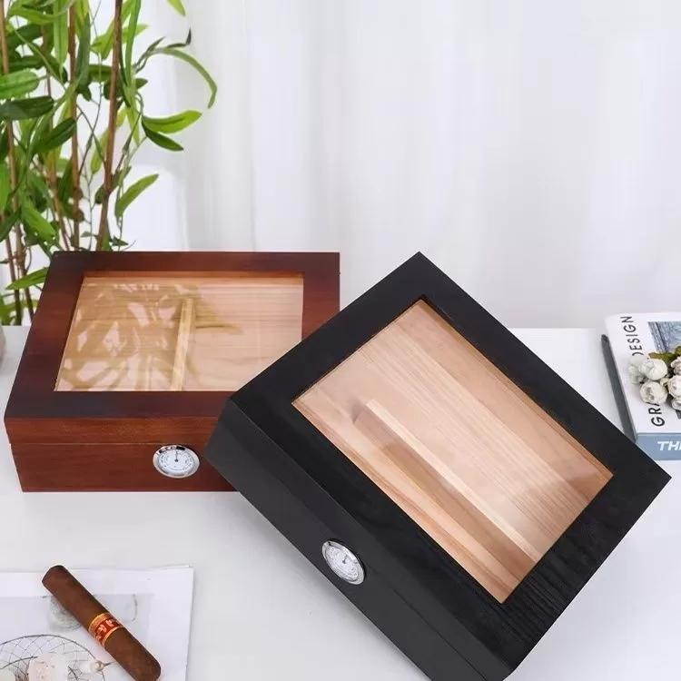 Dimensions: 26cm L x 22cm W x 8.5cm H Materials: Premium cedar wood, tempered glass, metal hardware Capacity: 50+ cigars (depending on size)