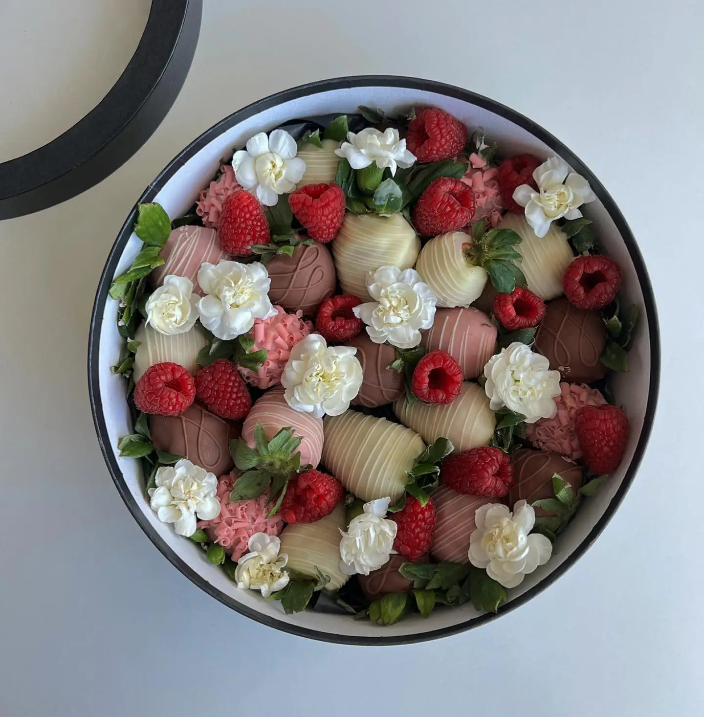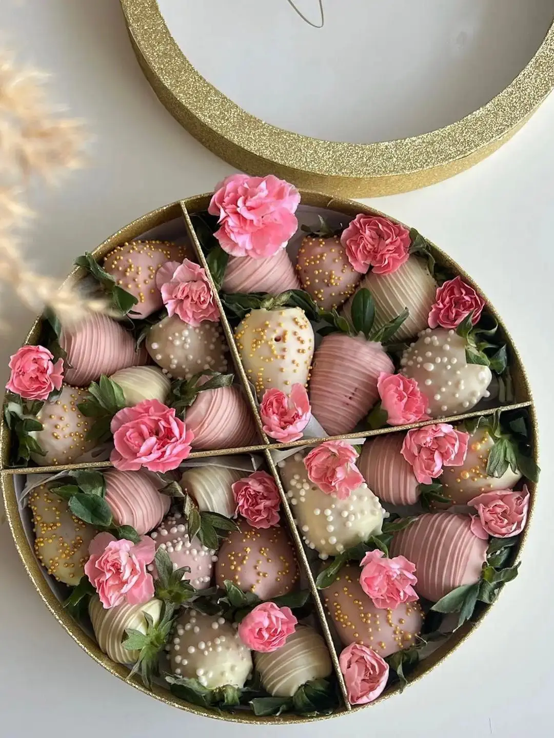 • ROUND GIFT BOX WITH DIVIDER – Designed with internal sections to neatly organize strawberries, chocolates, or pastries, preventing items from shifting and keeping them in perfect condition.