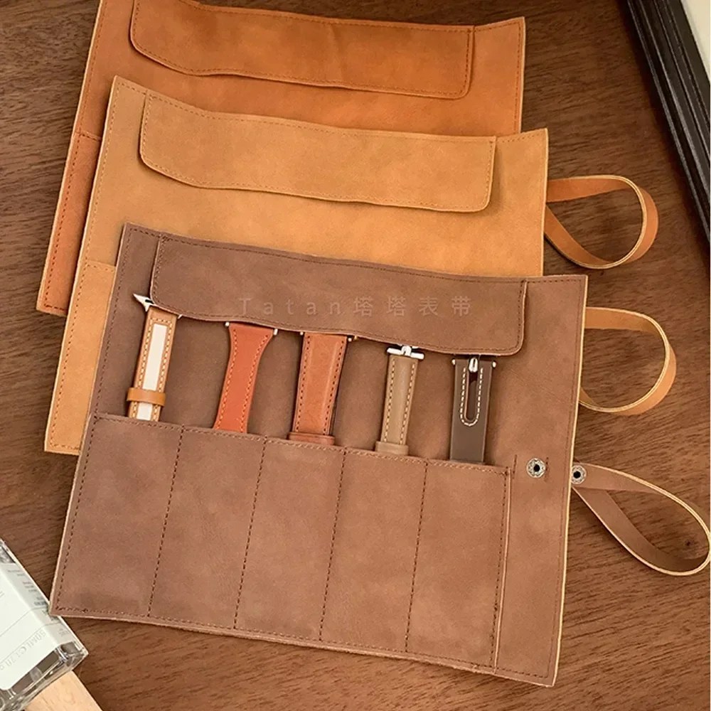 This elegant leather watch band roll is crafted for collectors and travelers who appreciate fine organization and craftsmanship. Designed with five spacious slots, it provides secure storage for watch straps, bracelets, or slim watches. Each slot is padded with a soft lining to prevent scratches and friction, while the roll-up format makes it easy to carry anywhere. The premium full-grain leather exterior adds a timeless touch that matures beautifully with use, making it both a functional case and a display piece.